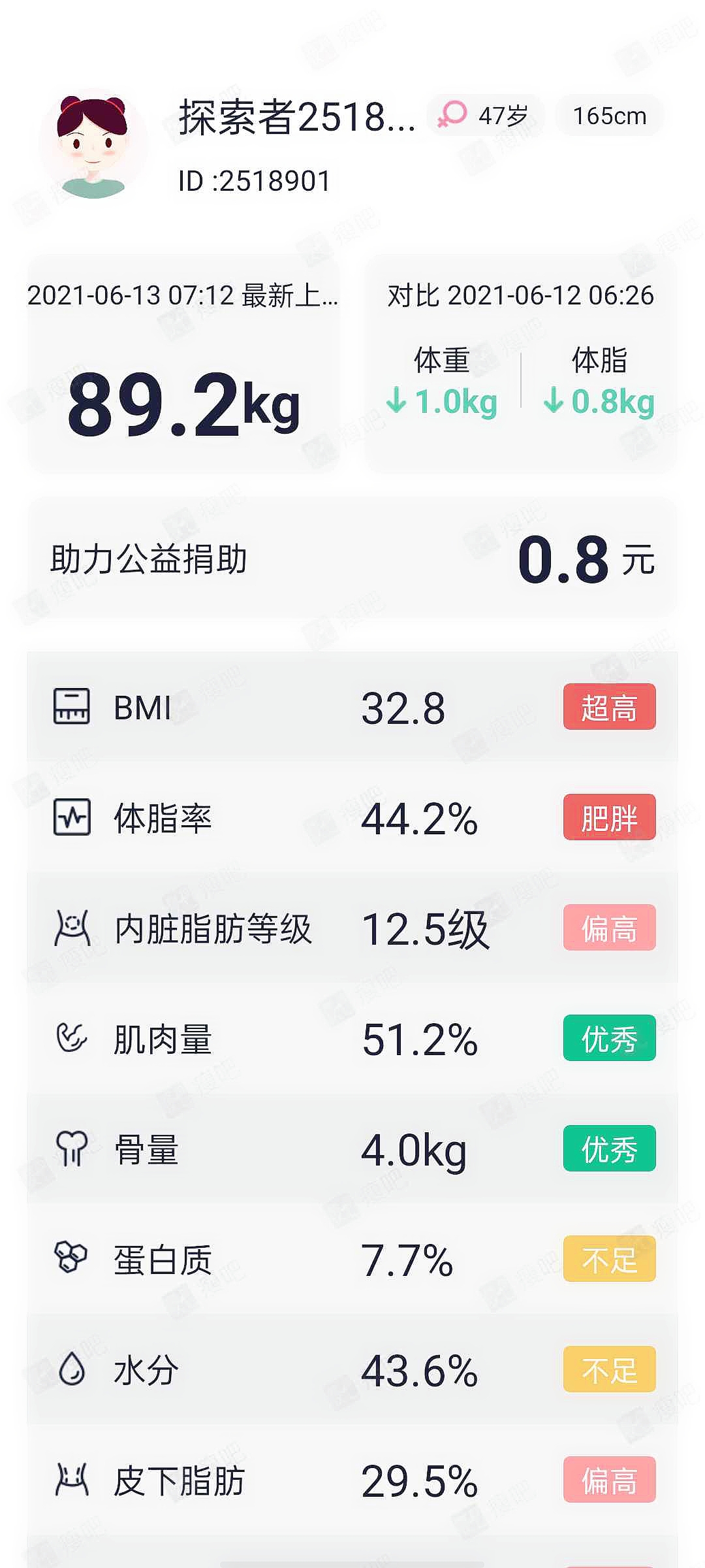 让我们一起来瘦吧!脂20科学减脂技术减肥第七天加油!昨天没有掉秤有点气馁,营养师非常认真的对我进行分析数据和鼓励建议我,我昨天严格控制住饮食没有任何违规行为,昨晚睡眠质量优良,今天早上起来直接减重一公斤,非常开心ヽ(○^㉨^)ノ♪