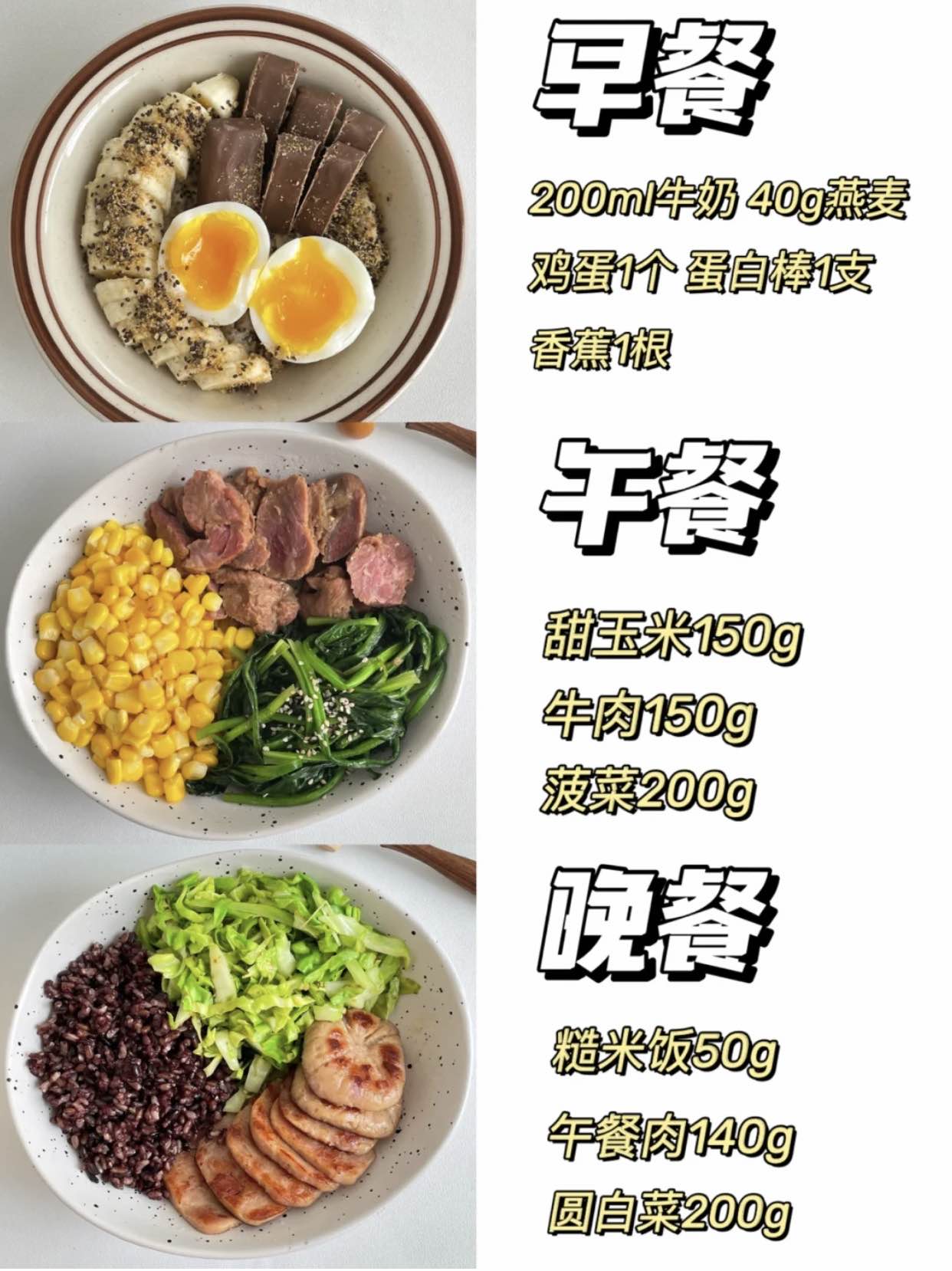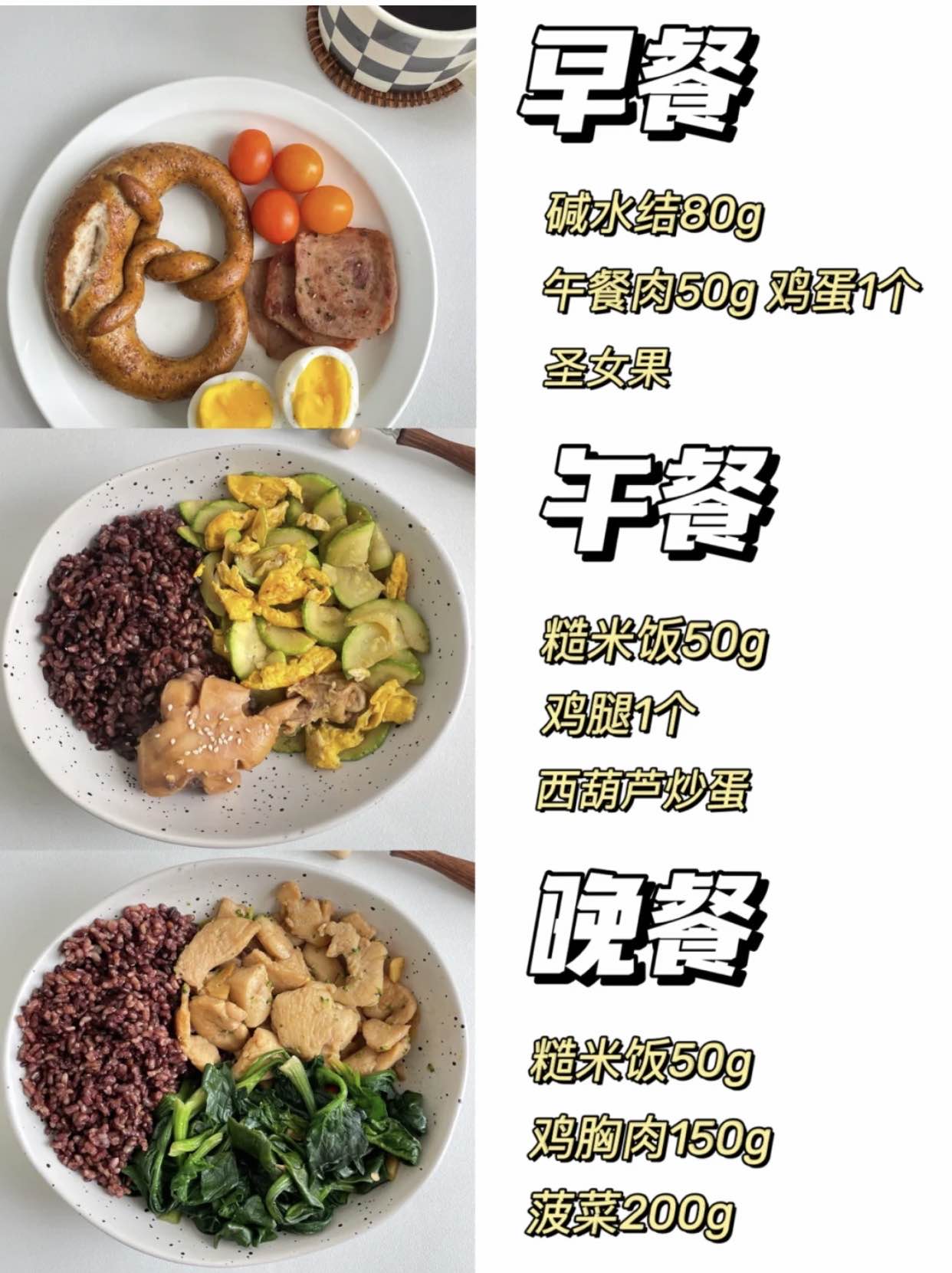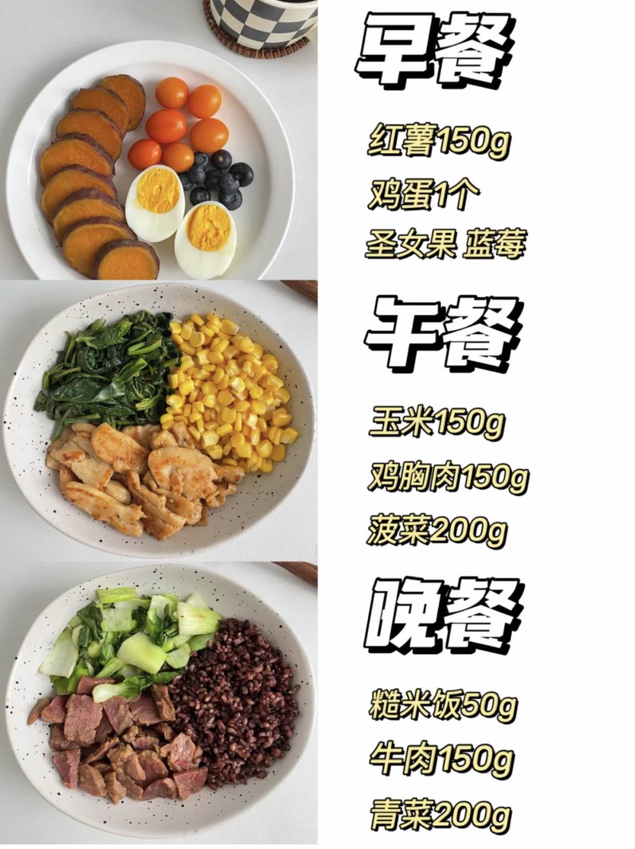 基本上是按照:主食+蛋白质+膳食纤维■早餐:主食1拳、牛奶200mL、鸡蛋1个■午餐:主食1拳、肉蛋100g、蔬菜2拳■晚餐:主食1拳、肉蛋100g、蔬菜2拳加餐:低糖水果