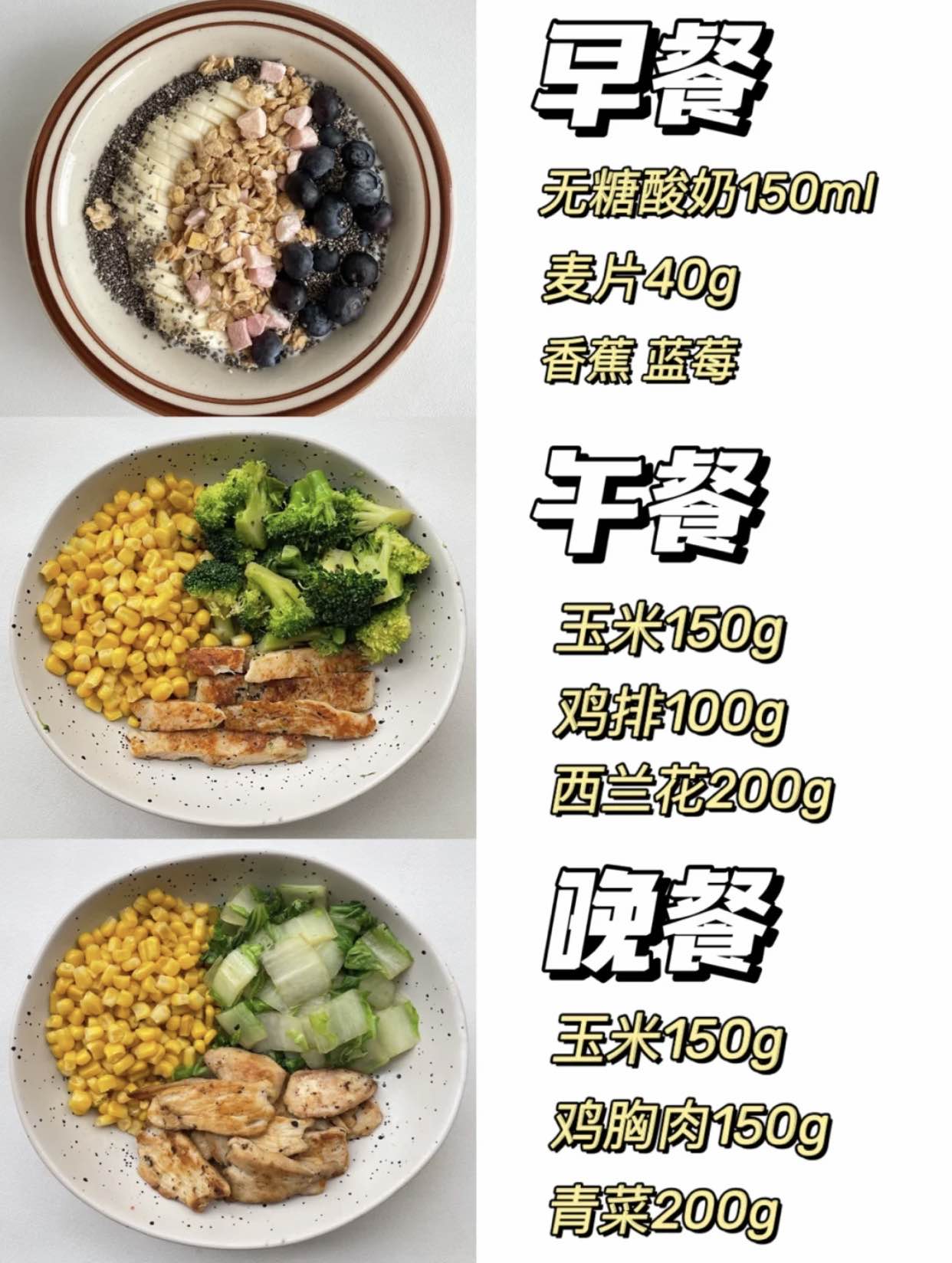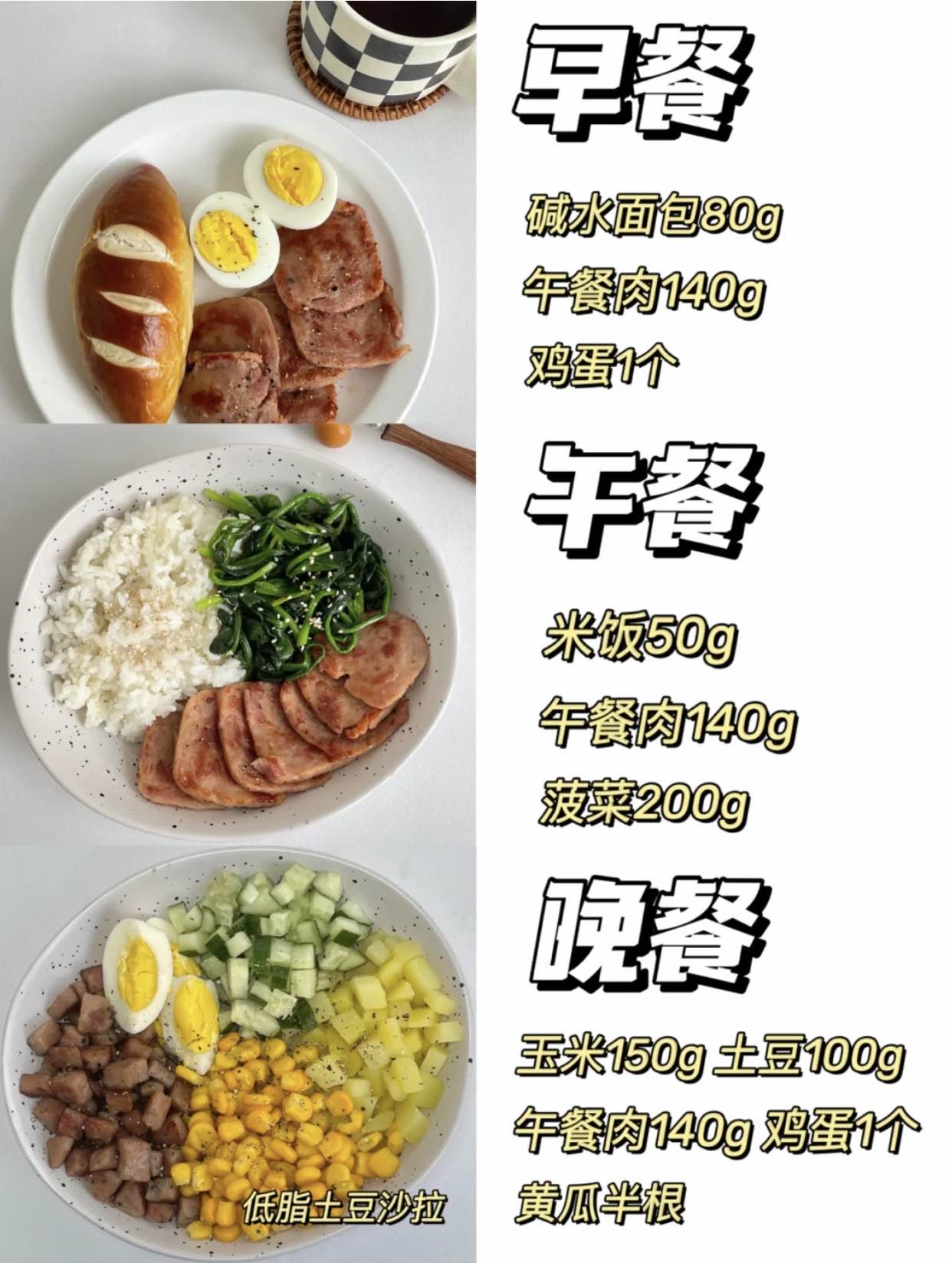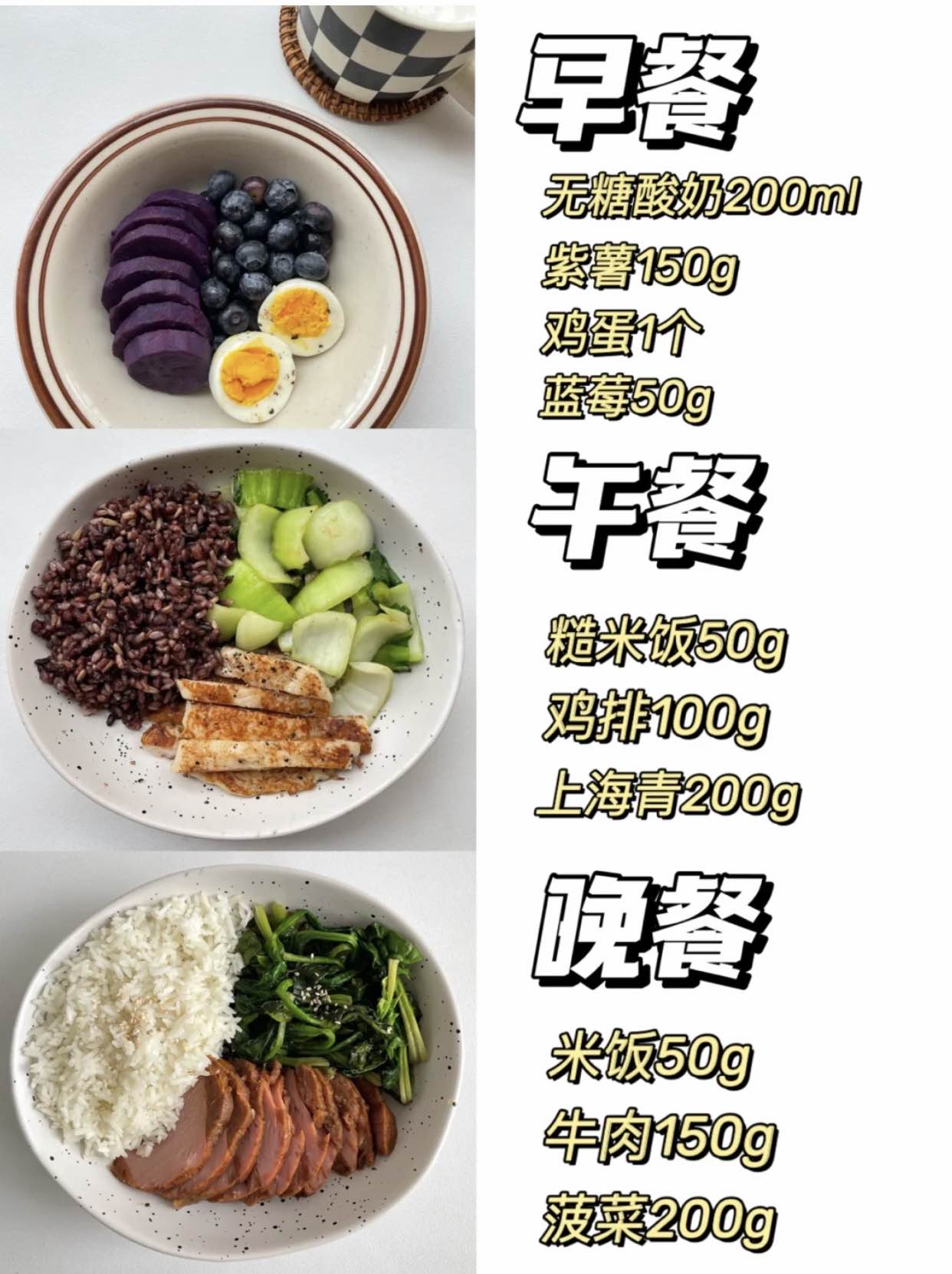 基本上是按照:主食+蛋白质+膳食纤维■早餐:主食1拳、牛奶200mL、鸡蛋1个■午餐:主食1拳、肉蛋100g、蔬菜2拳■晚餐:主食1拳、肉蛋100g、蔬菜2拳加餐:低糖水果