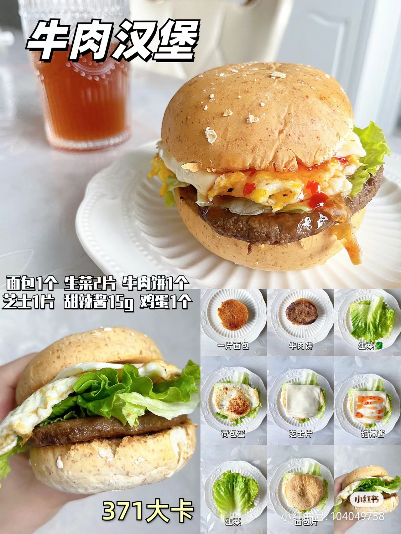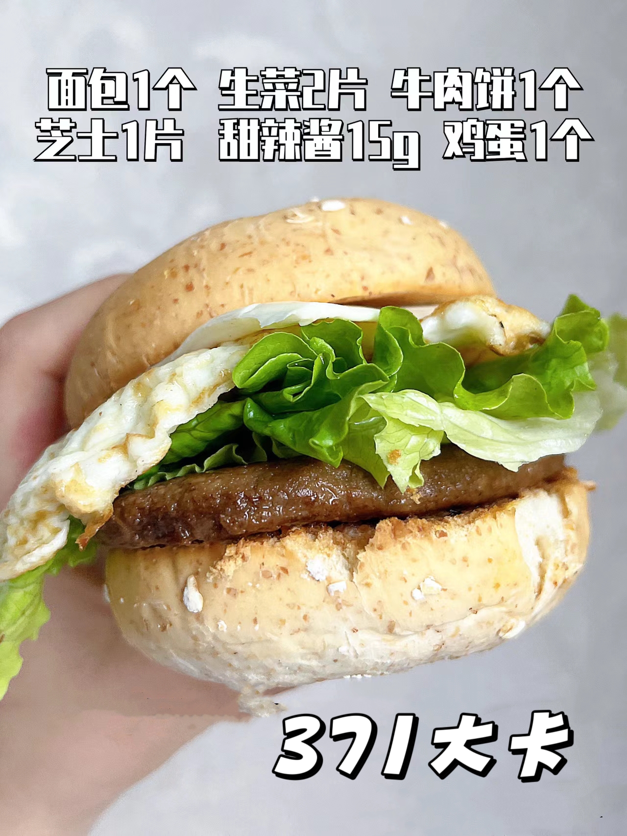 🥥食材:全麦面包➕生菜➕牛肉饼➕芝士片➕荷包蛋➕甜辣酱(生菜可以换成黄瓜)