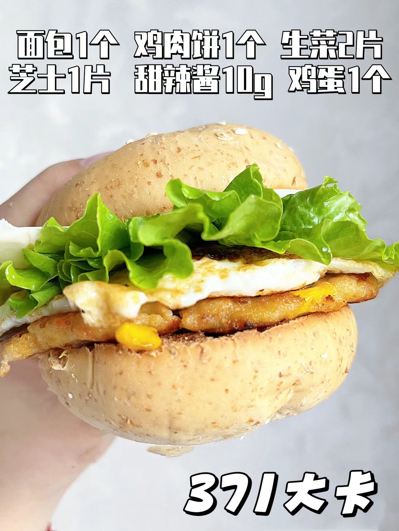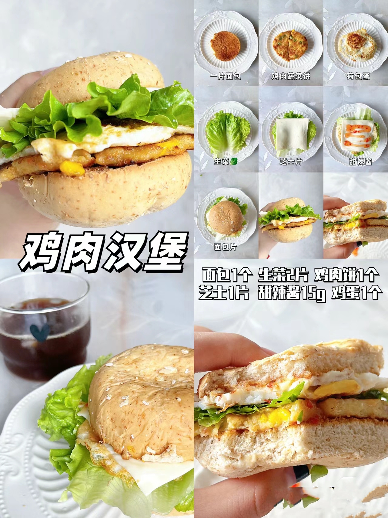 🥥食材:全麦面包➕生菜➕芝士片➕鸡蛋➕鸡肉饼➕甜辣酱