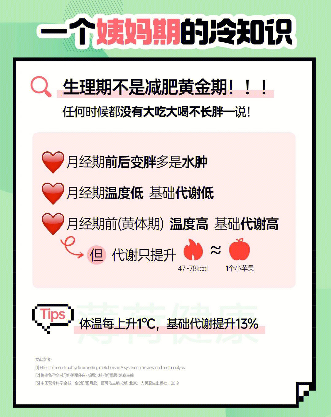 月经期前(黄体期) 温度高基础代谢高,但每天提升的这点代谢也就47~78kcal (约1个小苹果的热量)
