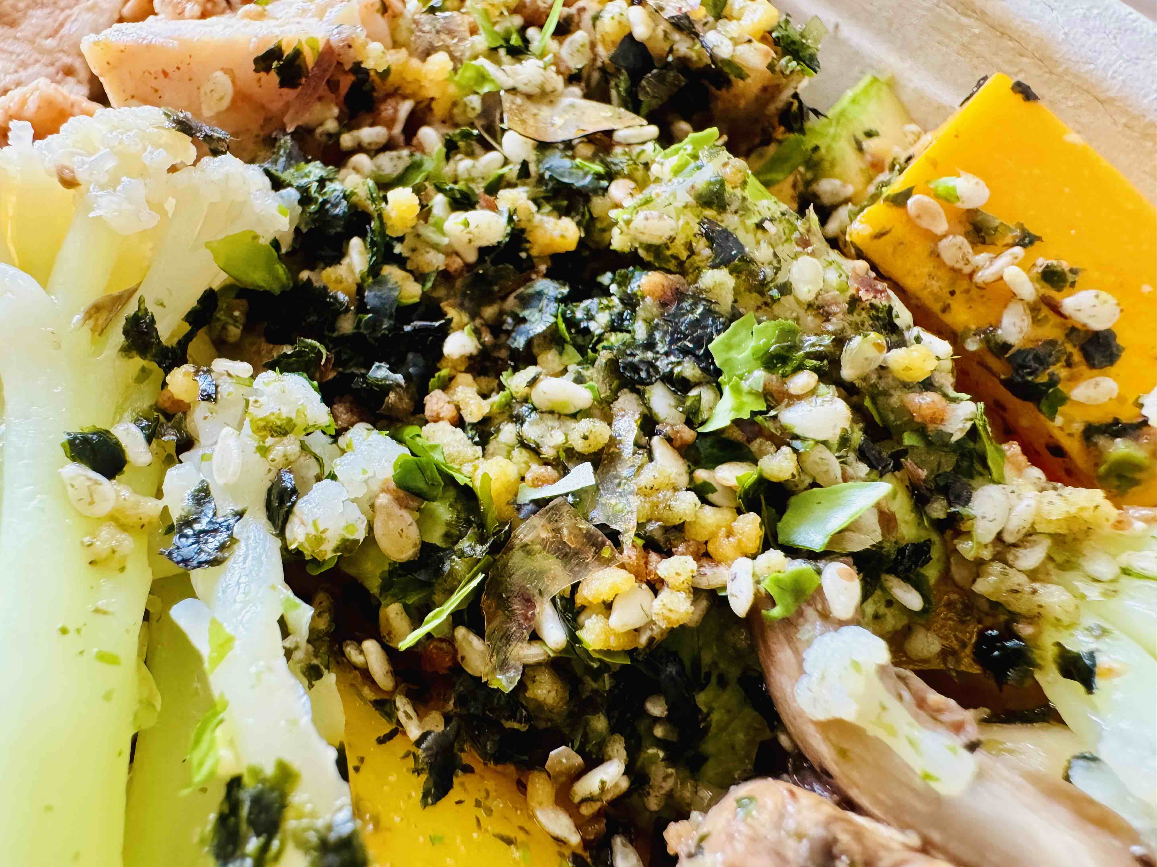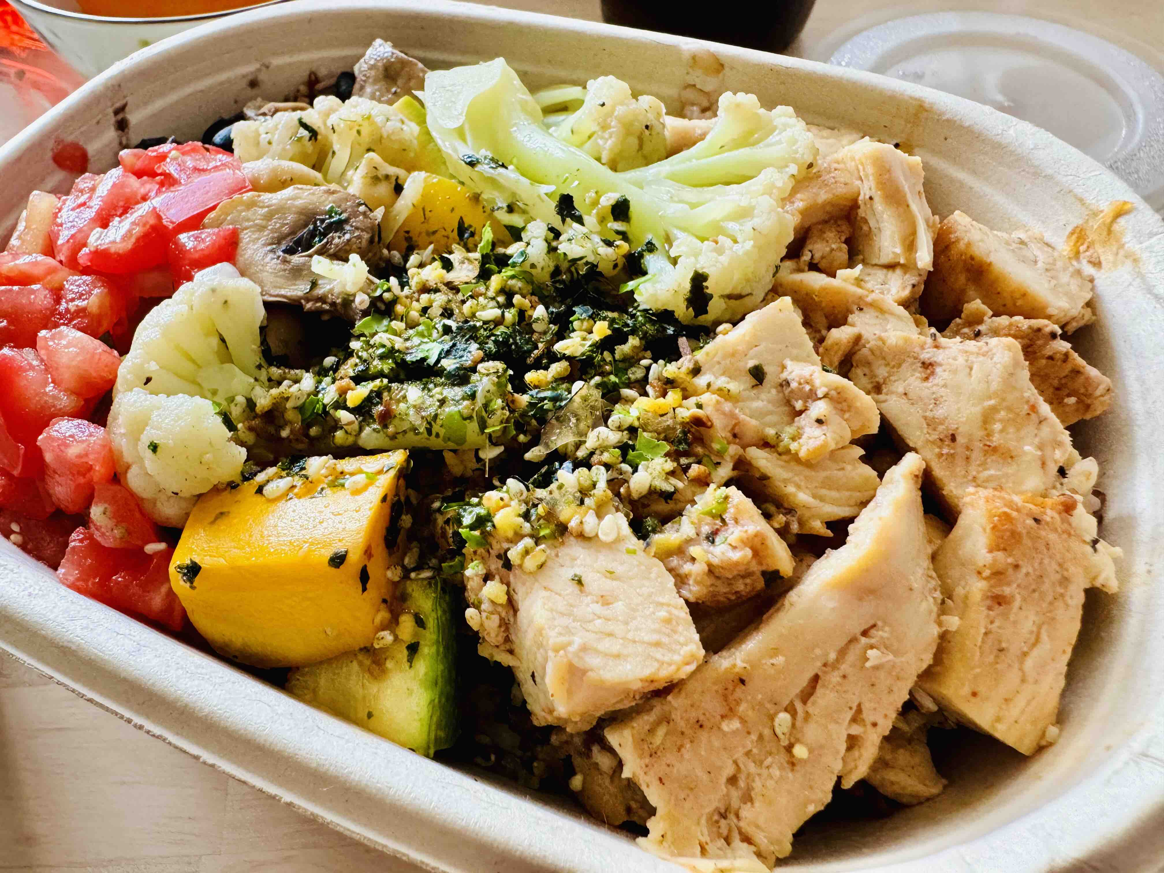 今天鸡胸肉+五种蔬菜+黑豆+谷物饭+厚烧鸡蛋+海苔碎+黄西红柿+油醋汁,多样化低脂餐