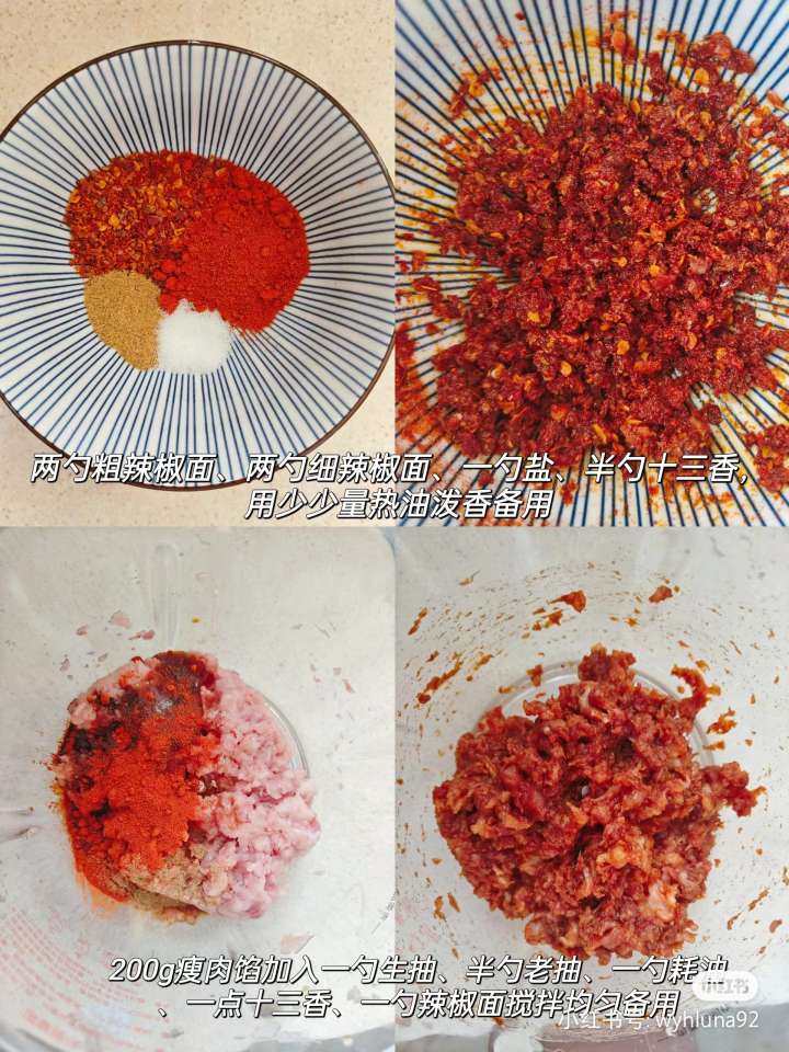 300g全麦面粉、200g水、5g酵母、200g瘦肉沫、葱花、辣椒面等