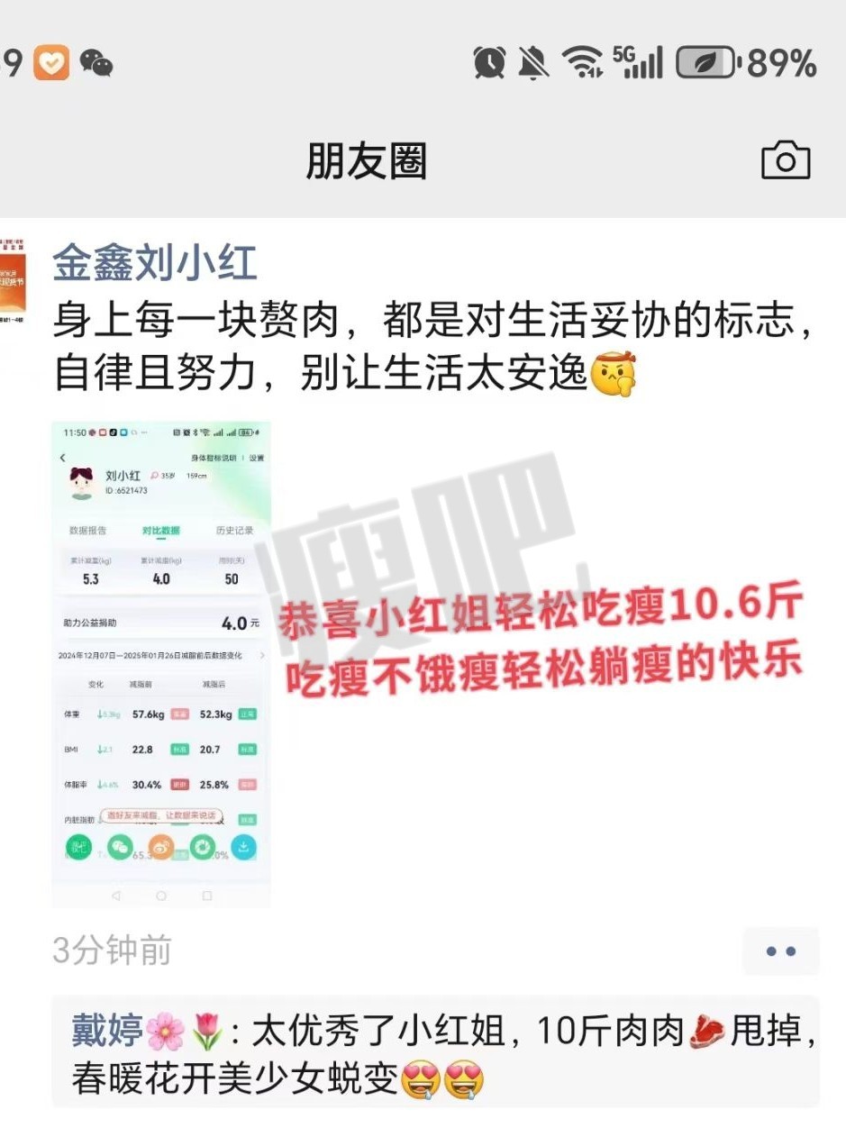 一开始试过节食、运动减脂,可店里工作太忙,根本抽不出时间规律运动,节食还让我饿得没精力接待客户,没坚持几天就反弹了。后来了解到瘦吧有体质营养师一对一陪伴,还能结合我的工作节奏定制饮食方案,不用饿肚子也不用刻意运动,特别适合我这种忙碌的职场人,就果断选择了这个服务。感谢遇到瘦吧体脂营养师戴京莹老师一路耐心陪伴专业指导我健康吃瘦!